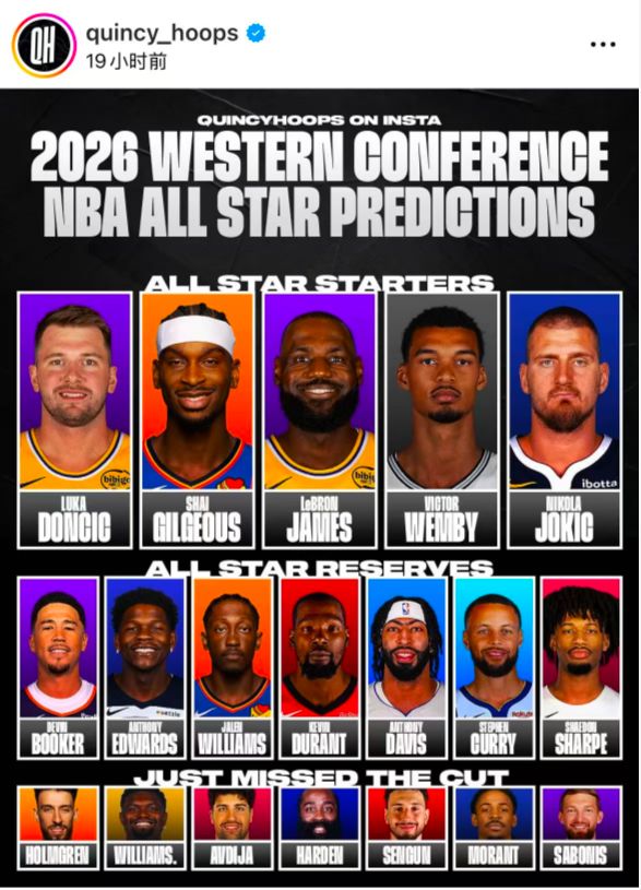 美媒预测东西部全明星阵容:41岁詹皇先发杜库替补 哈登大帝落选